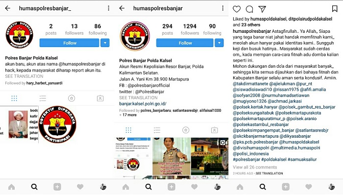 Akun ini muncul sekitar dua jam yang lalu. Terbilang berani karena menulis di kolom profil bahwa akun @humaspolresbanjar telah dihack dan silakan report akun tersebut.