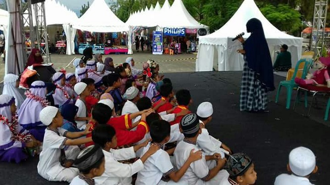Anak panti dari Pesantren Hidayatullah, Banjarbaru itu dihibur dongeng dari Enik Mintarsih dan dipandu Eqy Morres selaku MC.