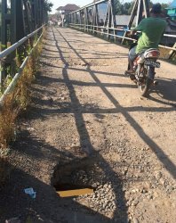 Jika anak anak yang jalan kaki khawatir bisa terperosok ke lubang yang ada di jembatan tersebut. "Hati hati kalau jalan kaki, kadang saya pakai sepeda motor bisa terkejut saat melihat ada lubang dan selalu berusaha menghindar dan rem mendadak," ungkapnya.