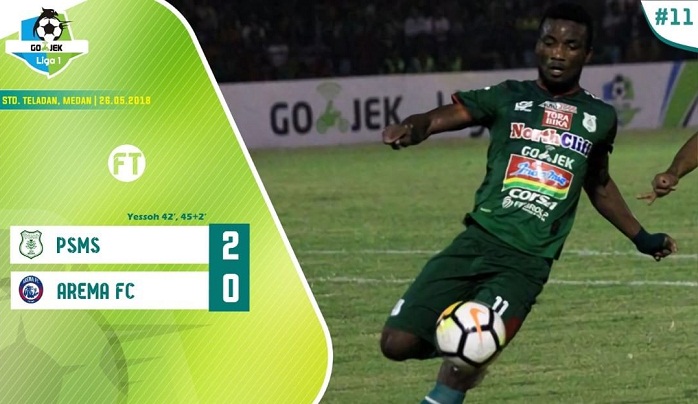 BANJARMASINPOST.CO.ID - Hasil akhir PSMS Medan vs Arema FC di babak pertama adalah 2-0. Dua gol PSMS dicetak oleh Wilfried Yessoh dalam lanjutan Gojek Liga 1 pekan 11 di Stadion Teladan, Medan, Sabtu (26/5/2018).