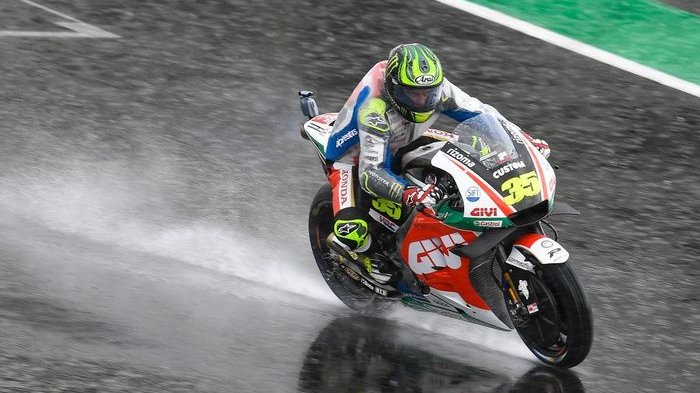 Pembalap yang mengenakan helm khusus hujan, salah satunya adalah Cal Crutchlow dari tim LCR Honda Team.