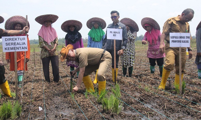 Plt Bupati HST HA Chairansyah, bersama jajaran DInas Pertanian Kalsel dan DInas Pertanian HST pada kesempatan itu ikut menanam padi, di lahan lokasi tanam perdana yang telah disediakan. Chairansyah berharap padi yang ditanam pertama tersebut bisa dipanen dengan hasil berlimpah, hingga bisa menghidupi para petani dan meningkatkan ekonomi keluarga petani,”katanya.