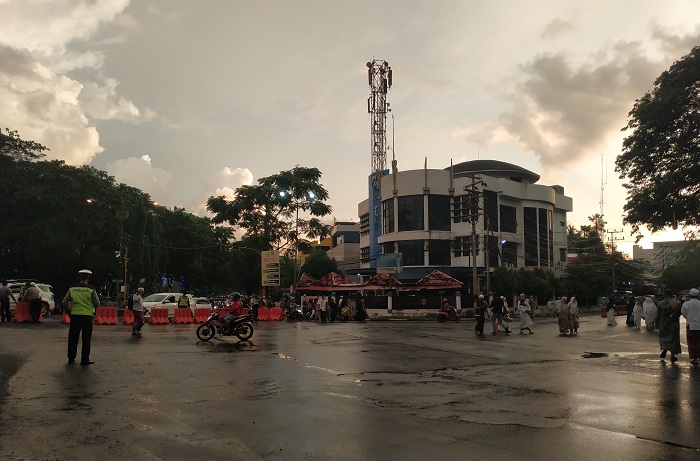 Meski demikian, masih terlihat sejumlah pengendara yang melintas di Jalan Sudirman di antara kerumunan jamaah yang datang.