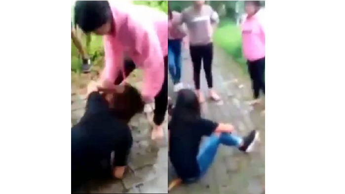 Perempuan remaja yang dihajar itu tampak mengenakan kaos hitam bercelana jeans. Dia tidak ada perlawanan. Parahnya, oleh seorang yang mengenakan busana merah muda (pink) terus-terusan dihajar.