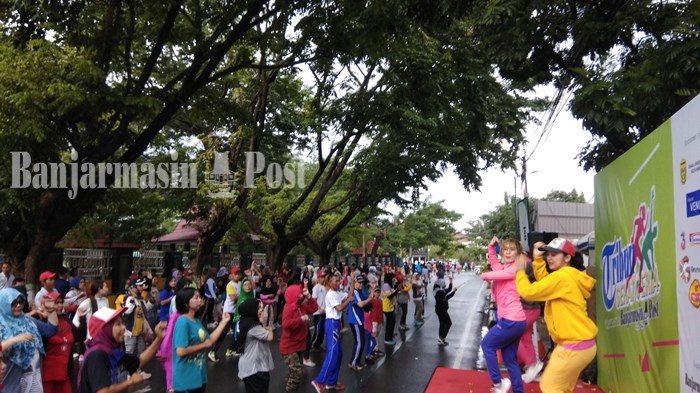 Meski diguyur hujan, tapi tidak menyurutkan semangat peserta yang mengikuti kegiatan Tribun Sehat Ceria Bersama Banjarmasin Post, Minggu (10/2/2019).