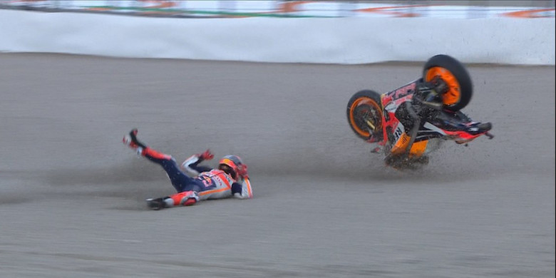 Sementara juara dunia MotoGP 2018, Marc Marquez, mengalami low side di Tikungan 16, dan untungnya tidak cedera.
