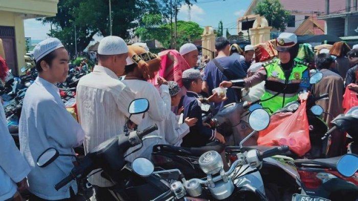 Begini Pengorbanan Polwan Polres Banjar, Rela Berpanas-panas Bagikan Nasi Bungkus Usai Salat Jumat