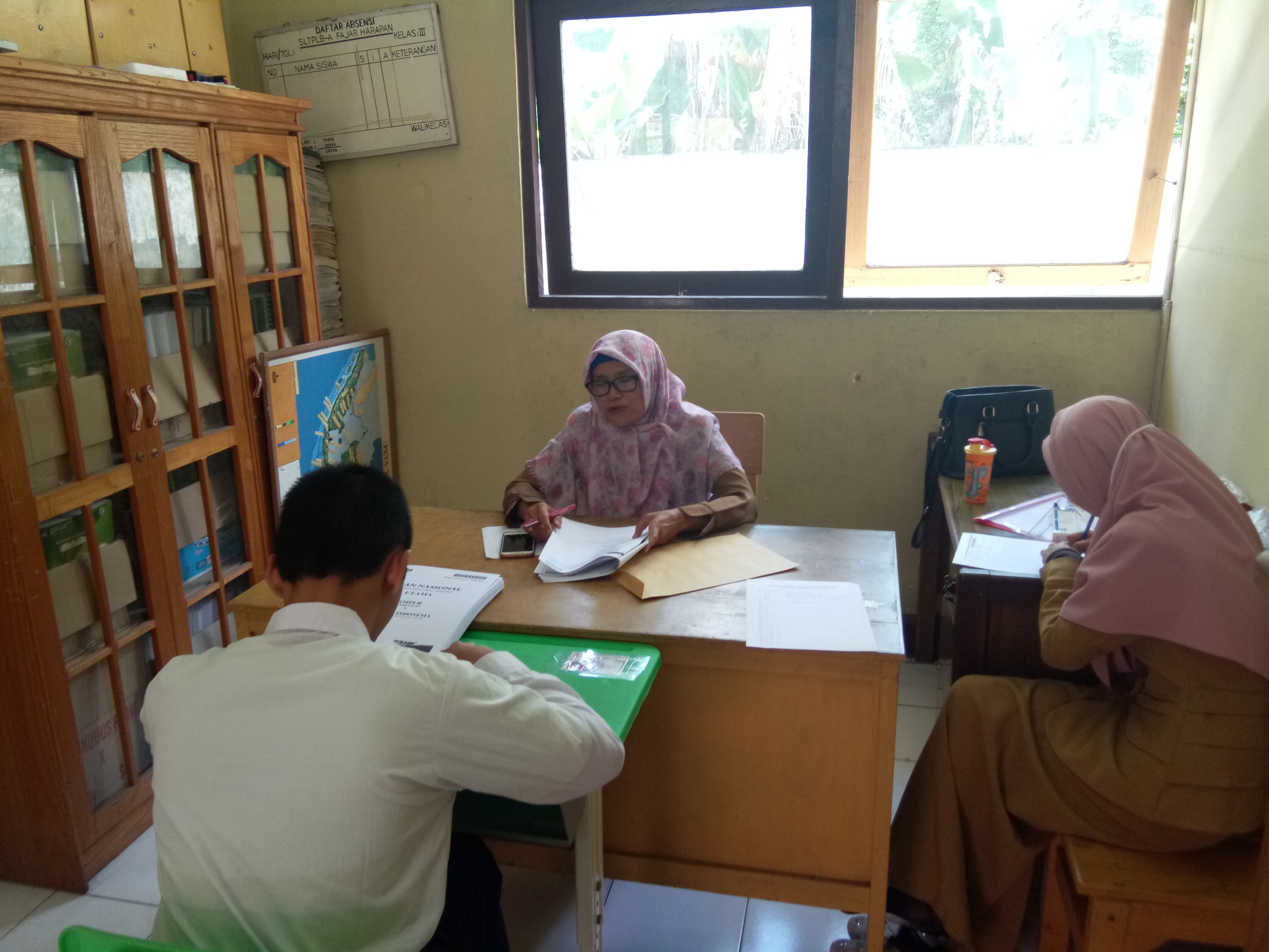 Sementara itu di dekat pintu masuk, duduk mengawasi dua orang pengawas dari sekolah lain yakni Yuliani dan Siti Aisah.