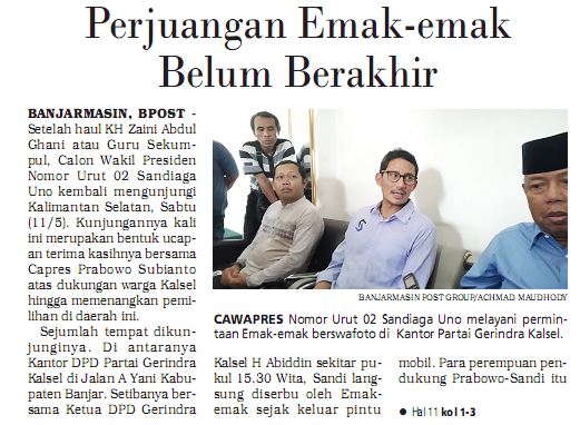 BANJARMASINPOST.CO.ID, BANJARMASIN - Setelah haul KH Zaini Abdul Ghani atau Guru Sekumpul, Calon Wakil Presiden Nomor Urut 02 Sandiaga Uno kembali mengunjungi Kalimantan Selatan, Sabtu (11/5).