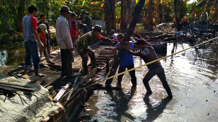 Bersama masyarakat, personil Koramil 1001-06 Amuntai Utara membersihkan puing-puing bekas kebakaran yang terjadi, Minggu (12/5/2019) malam sekitar pukul 20.30 wita.