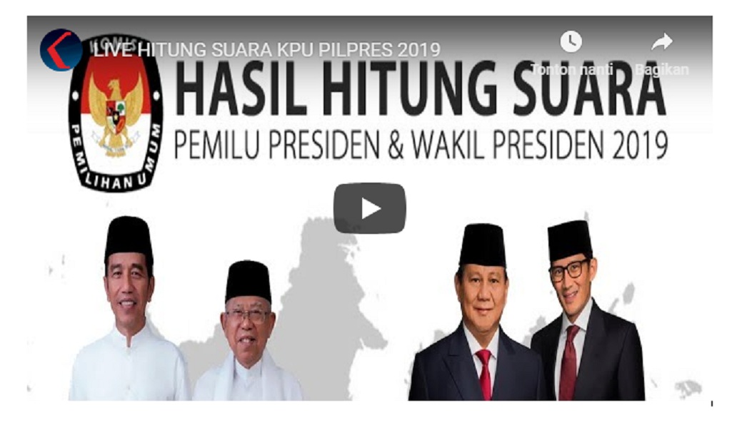 Simak update terbaru hasil Real Count Pilpres 2019 resmi dari Komisi Pemilihan Umum, Minggu (19/5/2019) pukul 21.00 WIB dikutip TribunPalu.com dari pemilu2019.kpu.go.id.