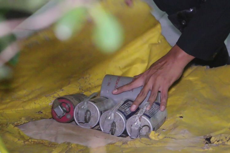 “Iya betul bahan peledak. Jumlahnya ada dua jenis. Bentuknya bulat satu buah di dalam kaleng mirip granat, satu (jenisnya) lagi dalam tabung kaya kaleng pilox (ada empat buah). Jadi lima cuma ada dua jenis,” kata Roland, Sabtu.