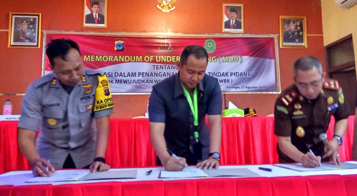 Penandatanganan dilakukan Kapolres Balangan AKBP Moh Zamroni, Kajari Balangan Tommy Kristanto dan Ketua PN Paringin, Rios Rahmanto.
