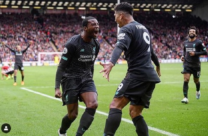 Georginio Wijnaldum begitu gembira dengan gol yang diciptakannya untuk Liverpool ke gawang Sheffield United di Liga Inggris, Sabtu (28/9/2019).