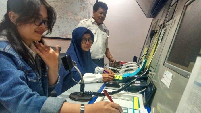 Petugas berbicara di depan speaker yang terkoneksi ke frekuensi yang diterima oleh pilot.