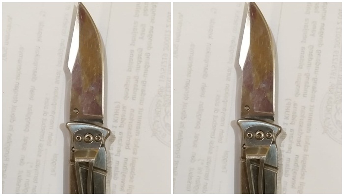Ketika badannya digeledah petugas, polisi menemukan senjata tajam jenis pisau lipat yang sangat tajam.