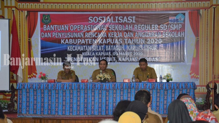BANJARMASINPOST.CO.ID, KUALAKAPUAS - Dinas Pendidikan (Disdik) Kabupaten Kapuas, Kalteng, menggelar sosialisasi Bantuan Operasional Sekolah (BOS) Reguler SD dan SMP serta penyusunan rencana kerja serta anggaran sekolah Kabupaten Kapuas tahun 2020, Senin (9/3/2020).