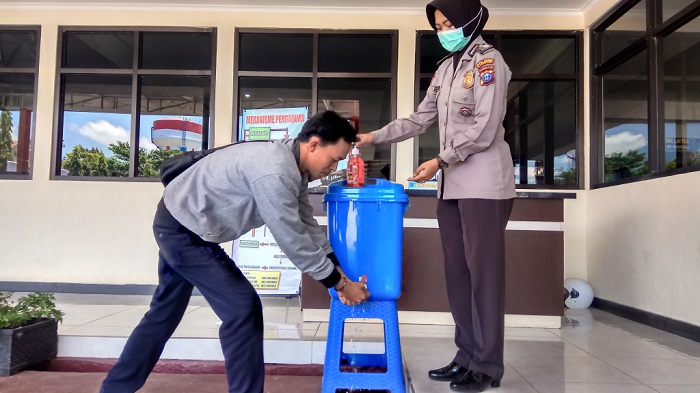 Polres HSU menyediakan fasilutas cuci tangan dan juga penyemprotan disinfaktan untuk mencegah penyebaran virus corona.