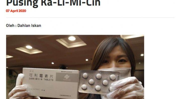 Unggahan mantan Menteri BUMN, Dahlan Iskan soal uji klinis Carrimycin untuk pasien Virus Corona atau Covid-19 ini diposting di blognya Disway.id yang diposting 7 April 2020.