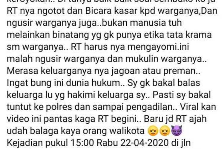"Ditanya baik-baik soal sembako kok jadi RT-nya ngotot dan bicara kasar kepada warganya, dan ngusir warganya juga," tulis akun tersebut.