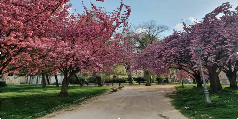 Bunga-bunga bermekaran saat musim semi di taman kota di dekat Basilika Saint-Remi, Reims. Biasanya, selalu ada orang yang bersantai atau bermain di taman ini. Namun saat ini, taman ini relatif sepi dari pengunjung.(DOK. PPI PERANCIS)