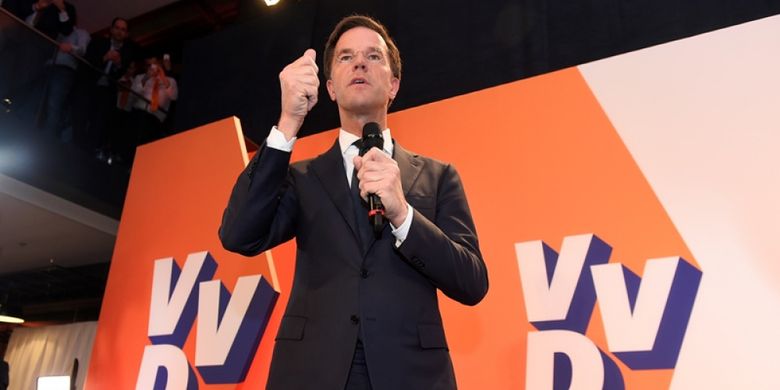 PM Belanda Mark Rutte memberikan pidato setelah partainya VVD menjadi pemenang pemilu.(JOHN THYS / AFP )