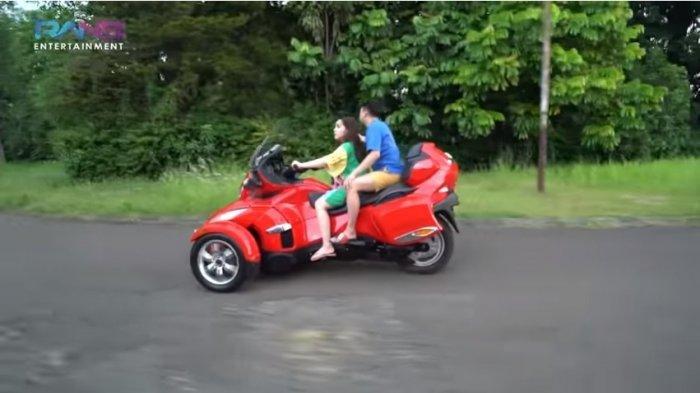 Nagita Slavina mengendarai motor Can-Am Spyder warna merah.