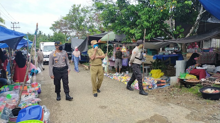 Kedatangan petugas ini untuk melaksanakan kegiatan sosialisasi kepada masyarakat yang ada di pasar terkait pelaksanaan menuju tatanan kenormalan baru.
