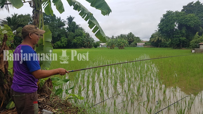 Pencari udang memilih mencari ikan di persawahan karena lebih aman dikonsumsi, daripada mencari udang di Sungai Tapin yang dicemari racun udang.