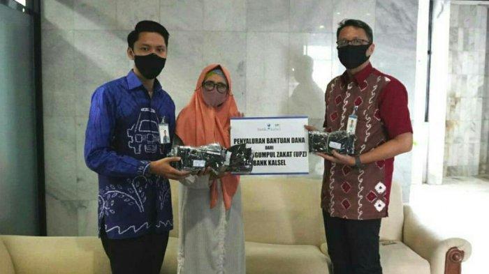 Penyerahan dilakukan Bendahara UPZ Bank Kalsel, M Ihya U Basri, didampingi Staf Amil UPZ Bank Kalsel, Muhammad Padli, kepada Ketua Yayasan Anak Bangsa mandiri Banua, Irma Suryani di Kantor Pusat Bank Kalsel, Kamis (18/6/2020).