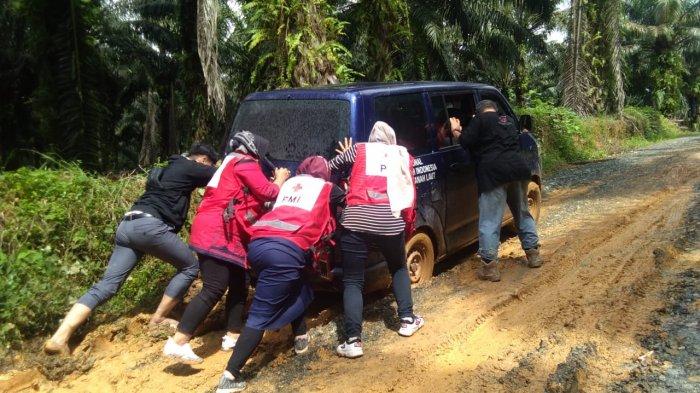Jalan menuju Desa Salaman dan Riamadungan rusak parah. Relawan PMI Tala pun terpaksa dorong mobil untuk sampai ke desa tersebut