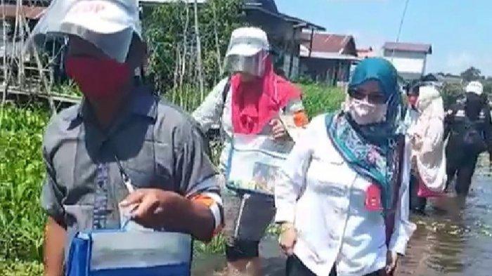 Rombongan Ketua KPU Kalteng, Ngismatul Choiriyah bersama anggotanya harus berjalan kaki menerobos banjir demi menjalankan tugas coklit Pilkada Kalteng