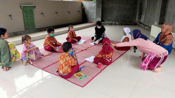 Memaksimalkan pembelajaran secara daring, guru SDN Sungai Malang 3 mendatangi siswa dan memanfaatkan teras masjid untuk mengajar