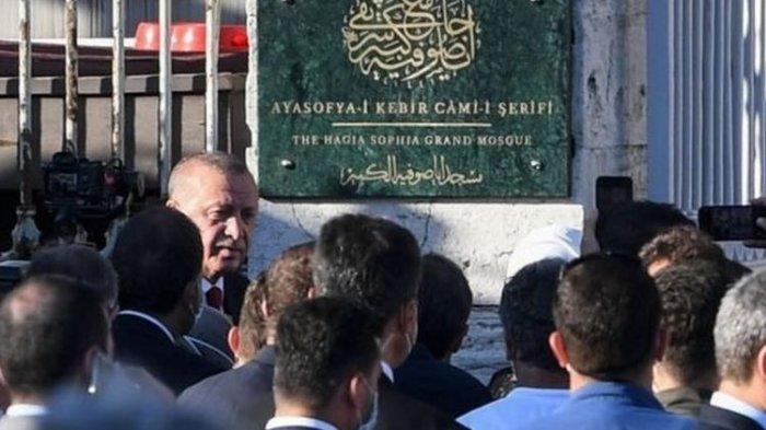 Pada Kamis kemarin, Erdogan bergabung dengan rombongan besar melakukan kunjungan mendadak untuk memeriksa persiapan akhir bangunan Hagia Sophia termasuk pembukaan tanda di pintu masuk yang bertuliskan, " Masjid Agung Hagia Sophia".
