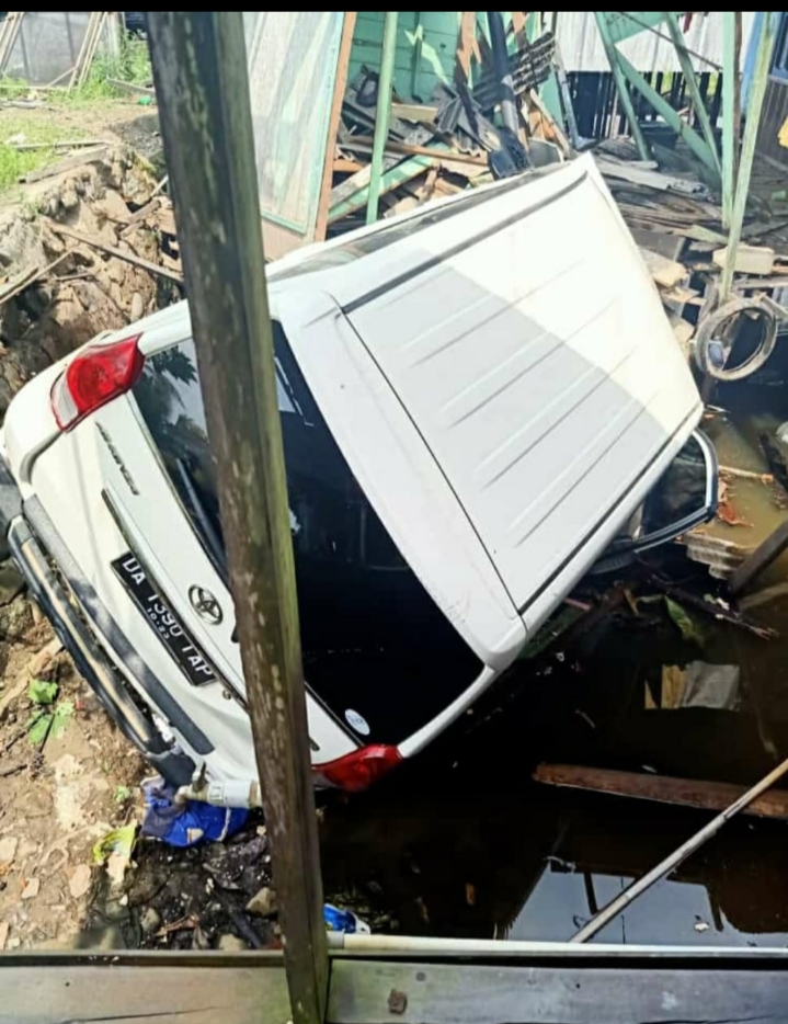Namun, bagian depan rumah korban yang tertabrak mengalami kerusakan akibat dihantam bagian depan mobil avanza putih DA 1390 TAP mengalami kecelakaan tunggal, Senin (27/7/2020), sekitar pukul 12.30 wita