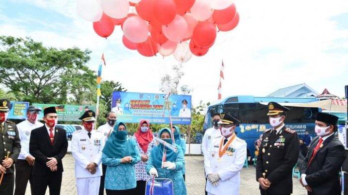 Bupati HSS H Achmad Fikry bersama Wakil Bupati Syamsuri Arsyad serta Sekda H Muhammad Noor dan anggota Forum Koordinasi Pimpian Daerah HSS turut hadir pada peluncuran Gebrak Masker yang ditandai pelepasan balon oleh Ketua TP PKK HSS Hj Isnaniah.