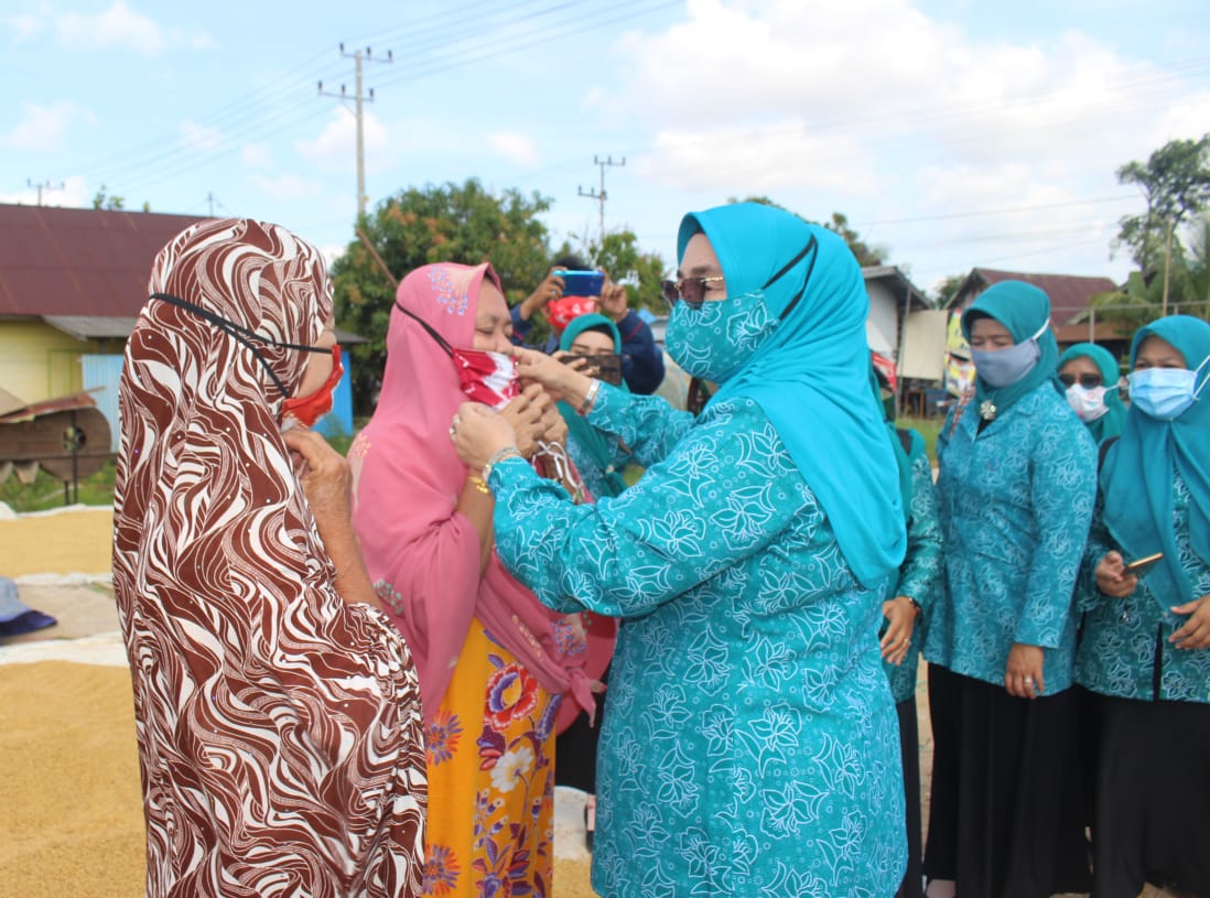 Dipimpin langsung oleh Ketua Tim Penggerak PKK Kabupaten Banjar Hj Raudathul Wardiyah, para pengurus PKK Kabupaten Banjar besama dengan kader di kecamatan dan desa membagikan ratusan masker di Desa Malintang Baru.