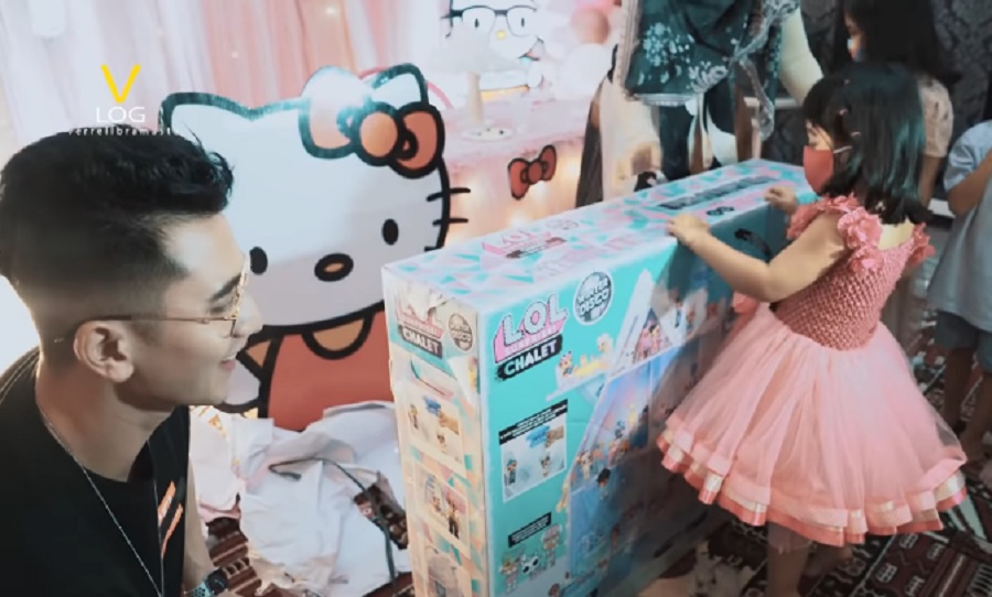 Mengenakan gaun pink dengan nuansa hello kitty, Vania mendapatkan kejutan berupa kado istimewa dari Verrell Bramasta.