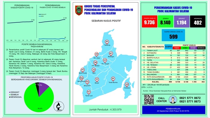 BANJARMASINPOST.CO.ID, BANJARBARU - Hari ini ada penambahan positif Covid-19 di Provinsi Kalimantan Selatan sebanyak 87 orang, Minggu (20/9/2020).
