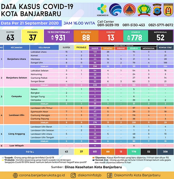 Berdasarkan data dari Dinas Kesehatan Kota Banjarbaru hingga pukul 16.00 wita, ada tambahan pasien Covid-19 sembuh sebanyak 52 orang di Kota Banjarbaru. Sehingga total pasien sembuh ada 778 orang.
