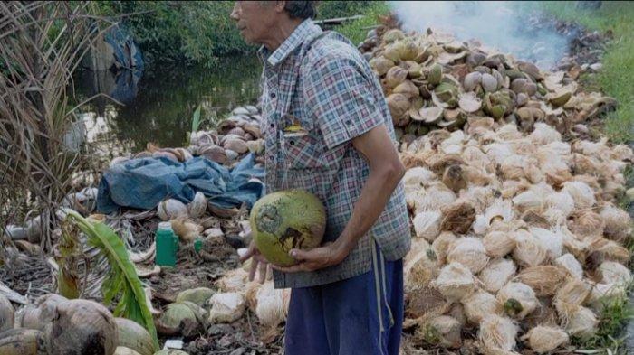 "Kami tinggal menunggu di parit pinggiran jalan besar saja, kemudian kelapa dikumpulkan dikuit atau dikupas, batoknya dijual," ujarnya.