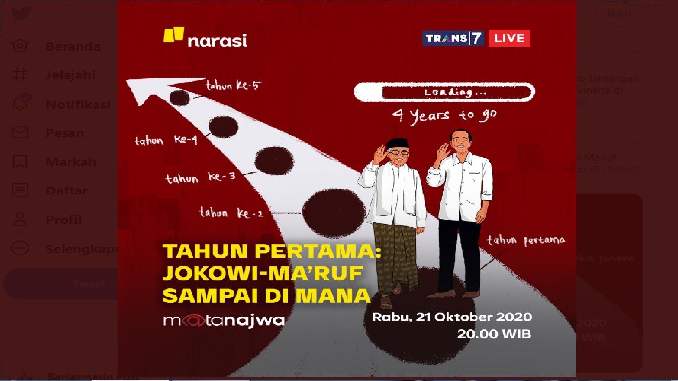 "Bagaimana kinerja pemerintahan Jokowi-Ma’ruf dalam menjawab tantangan itu satu tahun ini? Apa langkah pemerintah untuk memperbaiki kinerja di tahun-tahun selanjutnya? " tulis akun twitter Matanajwa.