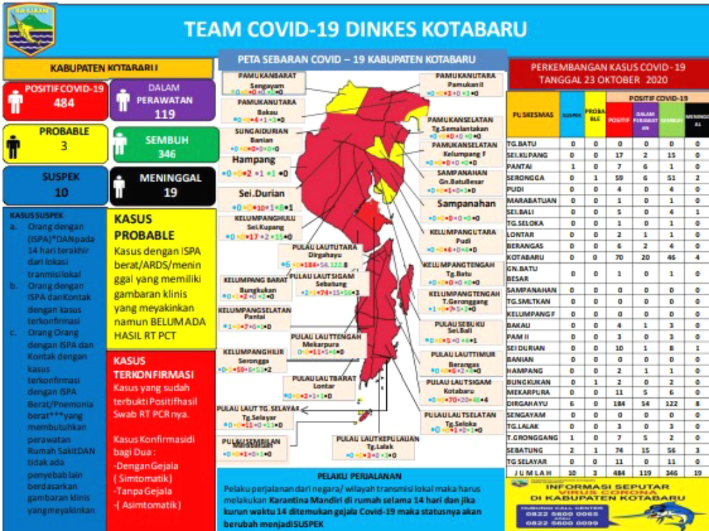 Info terbaru berdasarkan data hasil laporan pemantauan kasus Covid-19 yang dirilis Dinas Kesehatan (Dinkes) Kotabaru per tanggal 23 Oktober 2019.