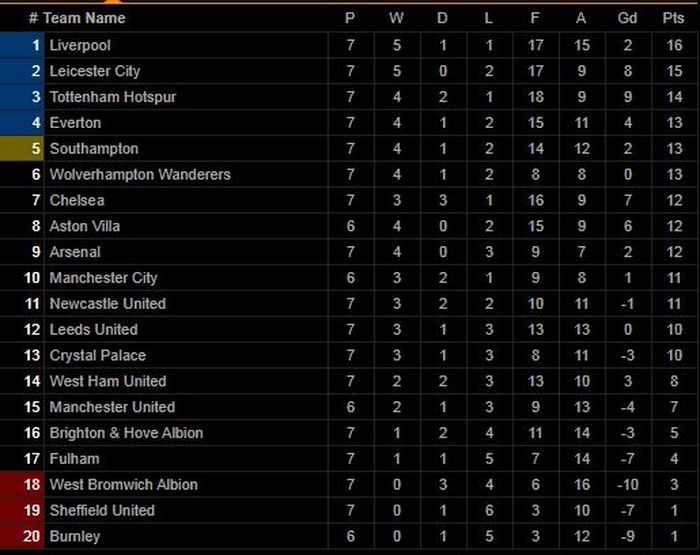 Klasemen Liga Inggris dan Top Skor Liga Inggris Hingga Pekan 7, Liverpool Masih di Puncak, Manchester United urutan 15, Son Heung-min memimpin 7 gol
