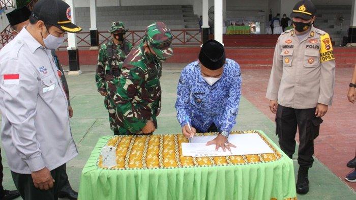 Selanjutnya, dilakukan penandatanganan komitmen bersama yang diawali Wabup Tapin H Syafrudin Noor disusul Komandan Kodim 1010/Rantau Letkol Inf Andi Sinrang dan Kabagops Polres Tapin, AKP Raindhard Maradona.