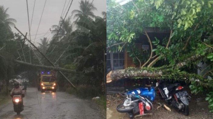 Angin puting beliung disertai hujan deras yang menerjang menyebabkan banyak pohon bertumbangan hingga menimpa rumah, sepeda motor hingga kabel listri