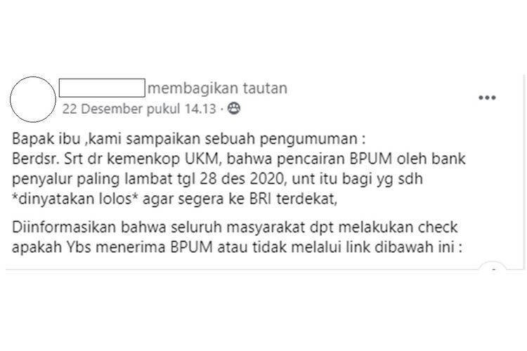 "Bapak ibu, kami sampaikan sebuah pengumuman : Berdsr. Srt dr kemenkop UKM, bahwa pencairan BPUM oleh bank penyalur paling lambat tgl 28 des 2020, unt itu bagi yg sdh *dinyatakan lolos* agar segera ke BRI terdekat," tulis akun Facebook Umy Tabita.