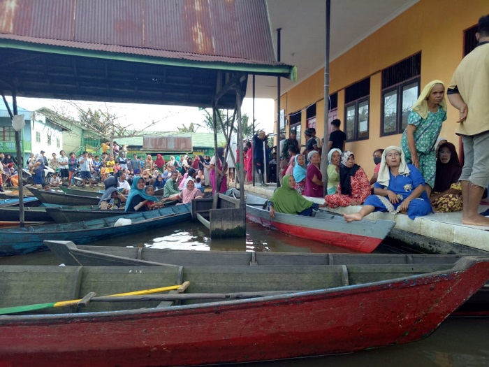 • Demi Dapatkan LPG 3 KG, Warga Sungai Pinang Banjar Naik Perahu Tembus Banjir ke Lokasi Operasi Pasar
