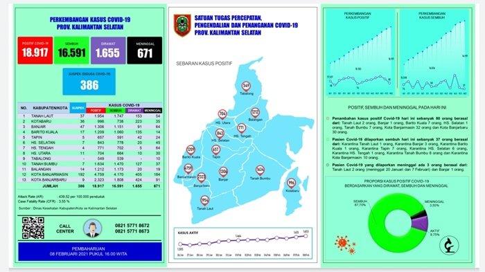 Kasus Covid-19 di Provinsi Kalsel, positif 18.917 orang, sembuh 16. 591 orang, meninggal 671 orang, dirawat 1.655 orang, suspek 386 orang.