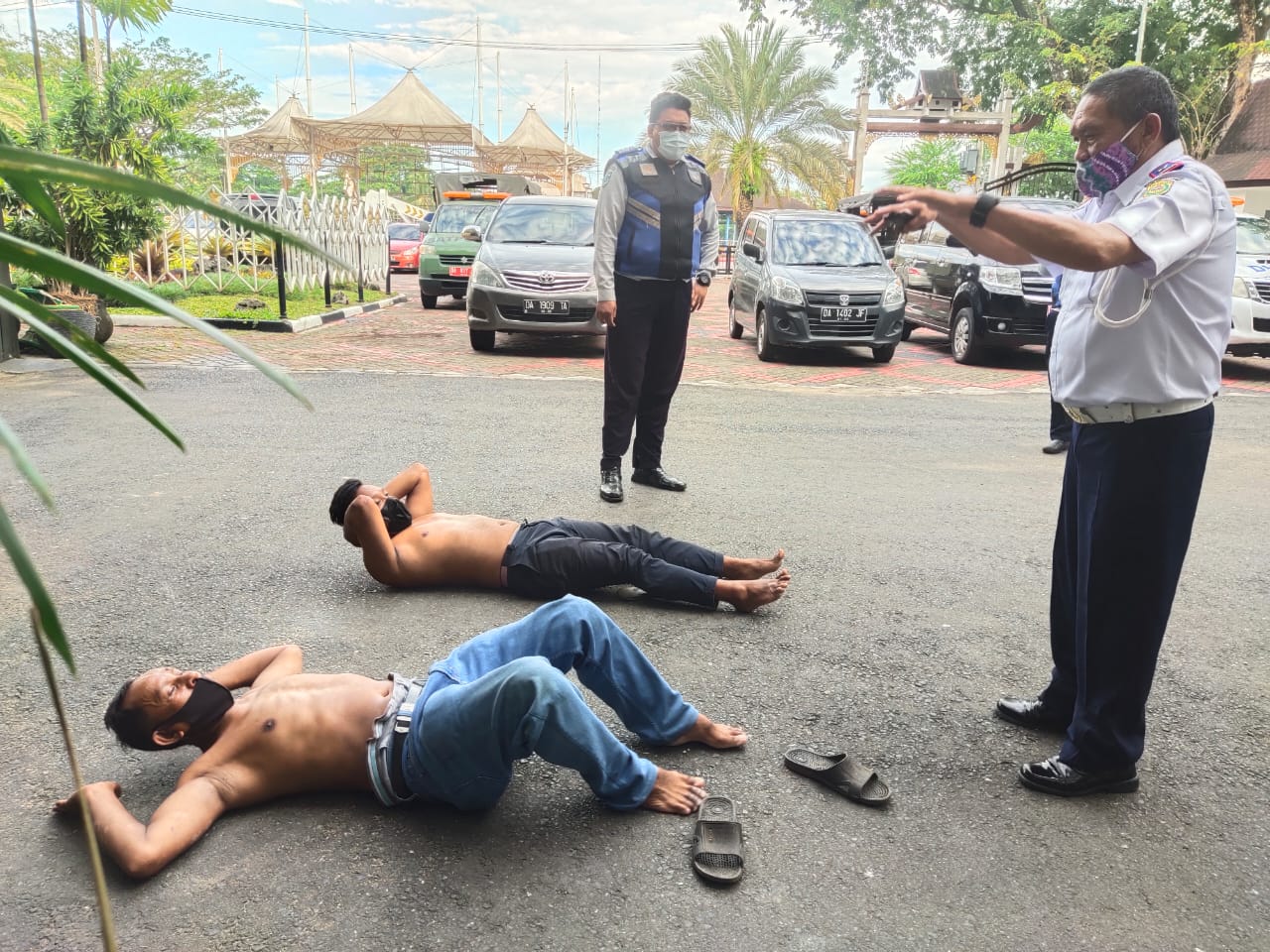 BANJARMASINPOST.CO.ID, BANJARMASIN - Dua orang sukarelawan pengatur lalulintas (Supeltas) diganjar hukuman fisik berupa squat jump, guling-guling, hingga push up di lapangan Balai Kota, Selasa (24/5/2021) sore.